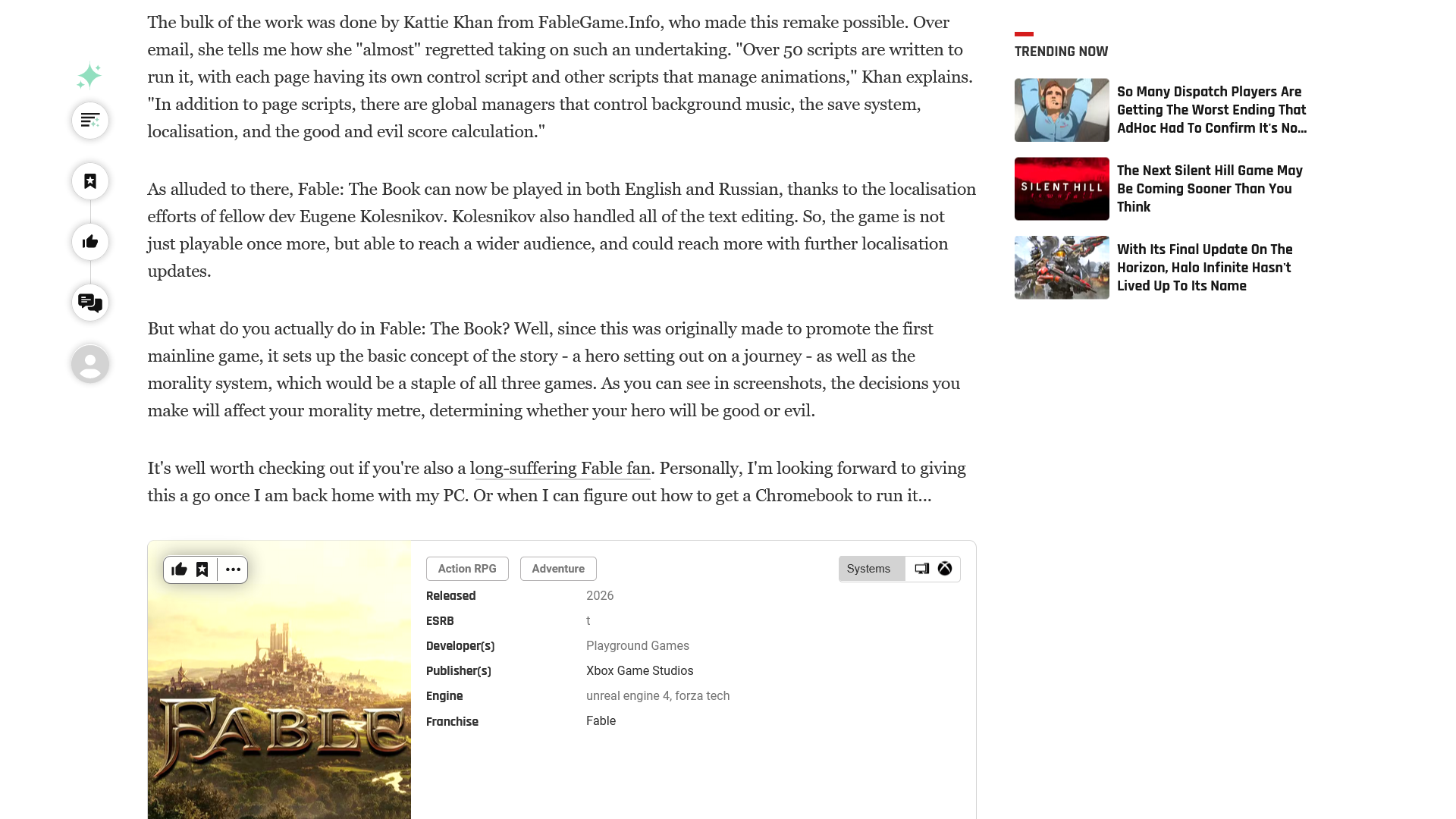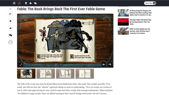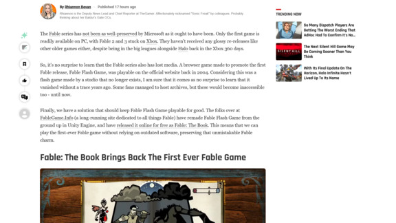 "Ребята с FableGame.Info (давно существующего сайта, посвященного всему, что связано с Fable) переработали Fable Flash Game с нуля на движке Unity и выпустили ее бесплатно онлайн под названием Fable: The Book. Это значит, что мы можем играть в первую в истории игру Fable, не полагаясь на устаревшее программное обеспечение, и сохранить неповторимое очарование Fable", — говорится в статье известной журналистки Рианнон Биван от 18 ноября.