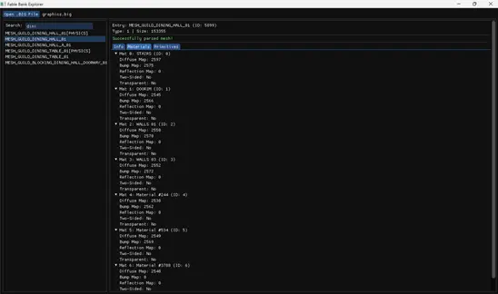 Самая первая версия программы называлась Fable Bank Explorer и была предназначена для файла с 3D-моделями — graphics.big, включая просмотр мешей с их физикой, работу с материалами, партиклами, костями, хелперами и функциями липсинка.