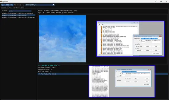 При этом утилита от AeoN получила новое название — Ego Core. От FE и CBox ее отличает современный интерфейс с темной темой, где игровые архивы напоминают вкладки браузера, есть удобный вьюпорт, небольшой текстовый редактор, компиляция ретейловых дефов и экспорт текстур в формат DDS. Дистрибутив пока не опубликован.