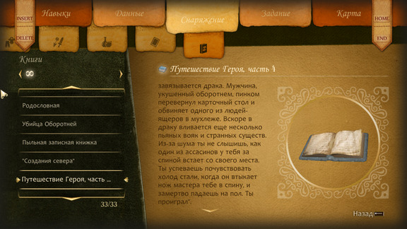 «Страница 76: "Ты благополучно устроился за самым дальним столом, в самом темном уголке подземной корчмы, как раз по соседству с шушукающимися ассасинами. Но как ни прислушивался ты к их спору, ничего кроме еле слышной абракадабры так и не разобрал. Столь велико было твое любопытство, что ты даже принялся незаметно подвигаться к их компании вместе со своим табуретом, как вдруг — БА-БАХ! В противоположном углу корчмы вспыхнула отчаянная потасовка! Верзила с мохнатым рылом одним пинком перевернул стол, за которым еще мгновение назад резался в карты с двумя лизардменами и зловещей красавицей и, клацнув зубами, обозвал одного из своих ящероподобных партнеров жулшиком! Спустя какие-то мгновения битва уже распространилась по всей корчме. В пылу сражения ты как-то упустил момент, когда за твоей спиной беззвучно вырос один из тех ассасинов. Так что всё, что ты успел ощутить прежде, чем бездыханным обрушиться на пол — это смертельный холод стали, входящей тебе под лопатку. Всё, короче. Хана. Ты умер. Гейм овер, малыш"».