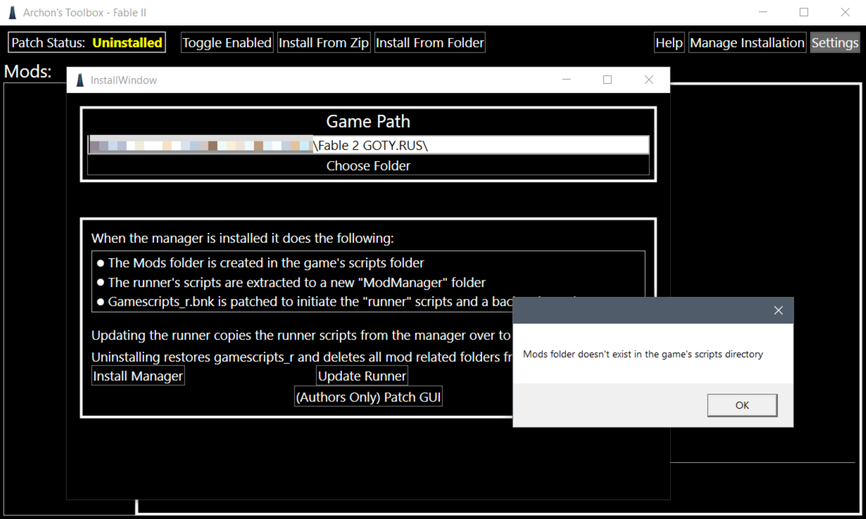 После этого программа сначала уведомит вас, что не нашла по этому пути папку со своими скриптами (статус сменится на желтый Uninstalled: игра непропатчена, менеджер модов и сами моды не запустятся).