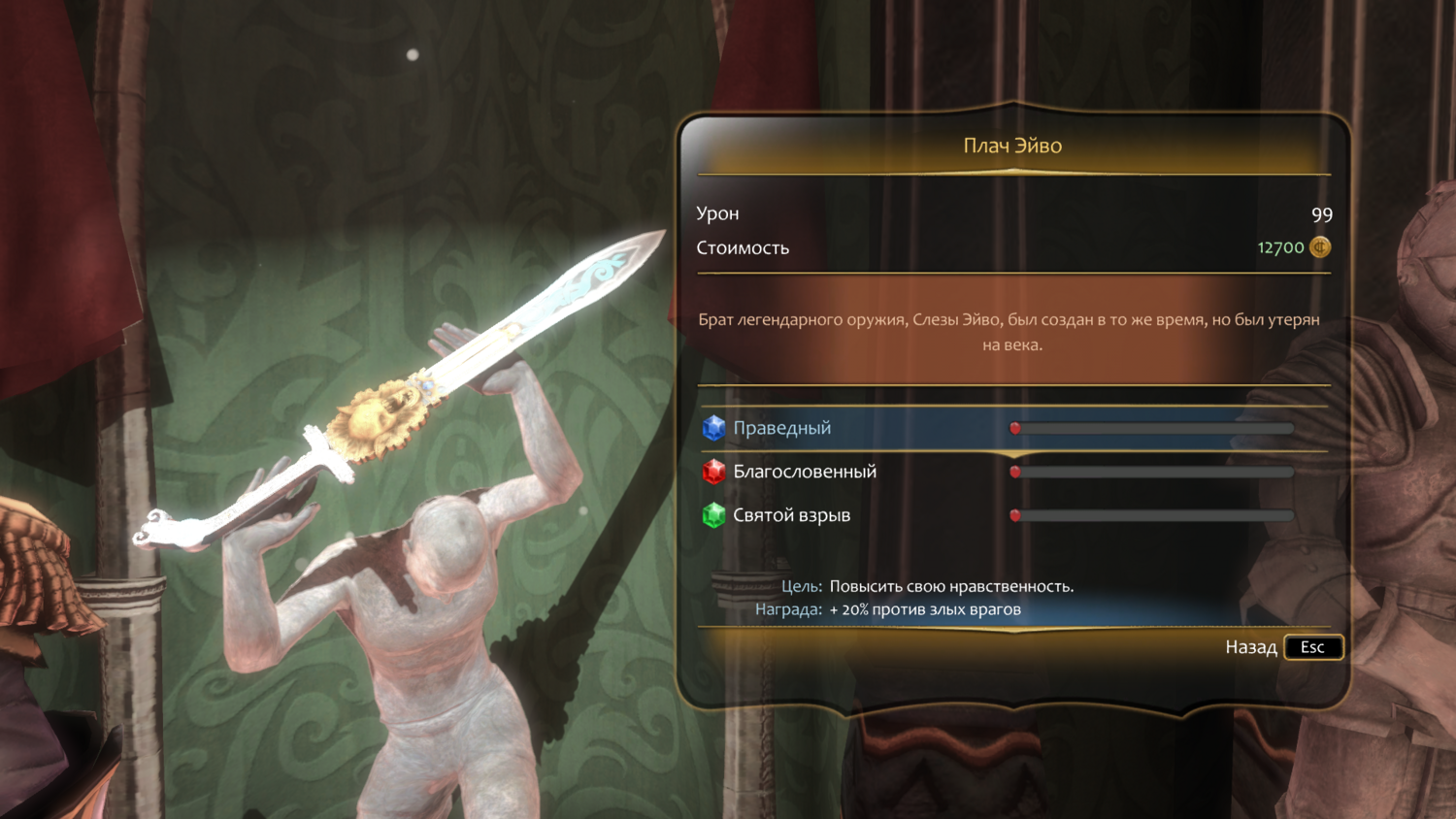 "Праведный". Цель: повысить свою нравственность. Награда: + 20% против злых врагов.