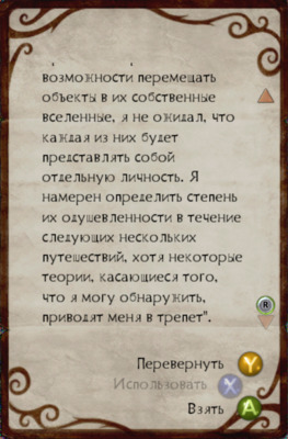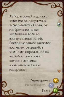"Лабораторный журнал с записями об оккультных экспериментах Гарта, от изобретения новых заклинаний воли до приготовления зелий. Последние записи касаются последних открытий, в частности нормальной на первый взгляд кровати, которая является проводником в иное измерение: