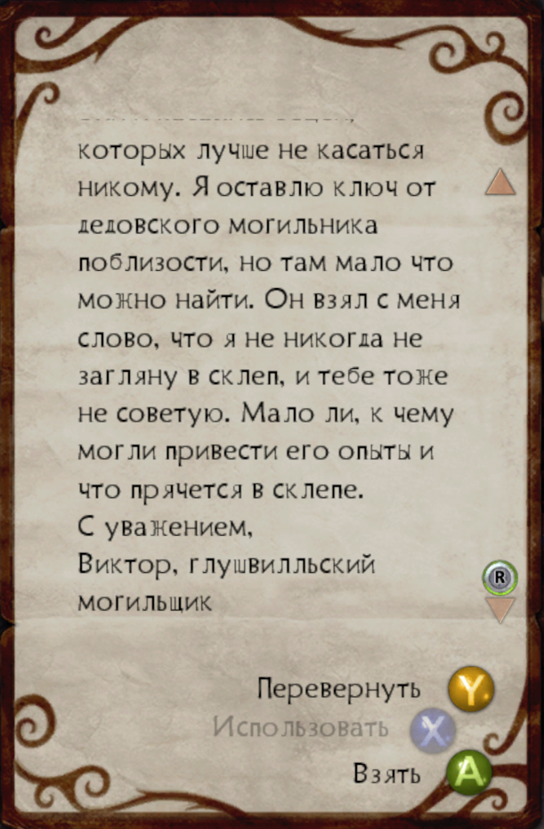 Я оставлю ключ от дедовского могильника поблизости, но там мало что можно найти. Он взял с меня слово, что я не никогда не загляну в склеп, и тебе тоже не советую. Мало ли, к чему могли привести его опыты и что прячется в склепе. С уважением, Виктор, глушвилльский могильщик".