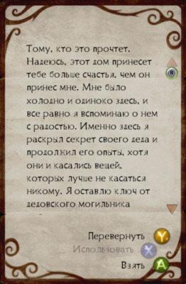 "Тому, кто это прочтет. Надеюсь, этот дом принесет тебе больше счастья, чем он принес мне. Мне было холодно и одиноко здесь, и всё равно я вспоминаю о нем с радостью. Именно здесь я раскрыл секрет своего деда и продолжил его опыты, хотя они и касались вещей, которых лучше не касаться никому.