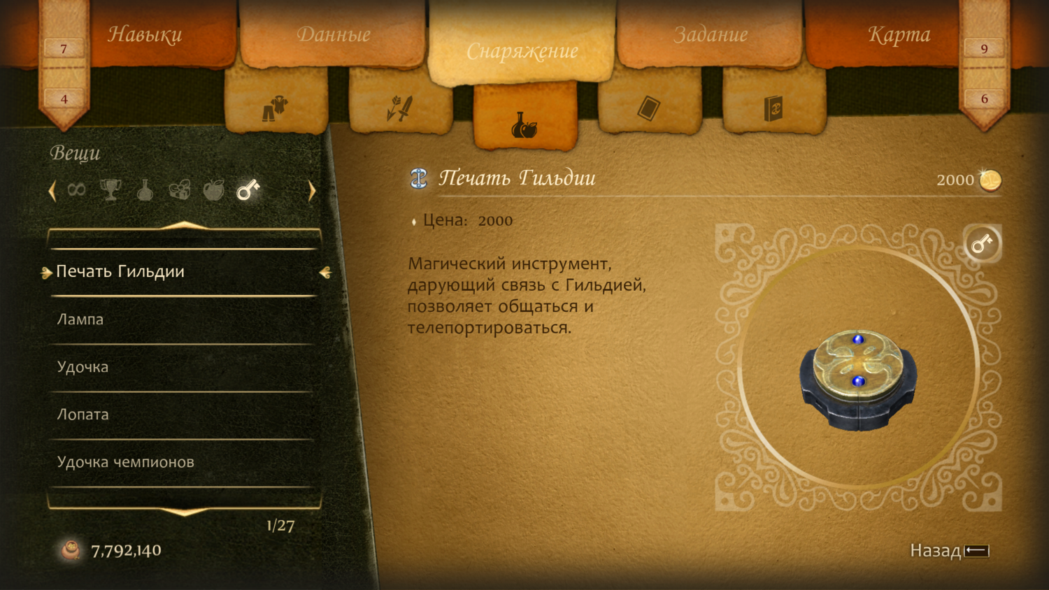 В инвентаре печать Гильдии относится к разделу "Прочее". Она имеет собственную иконку и формально стоит 2000 золотых, но ее нельзя продать.
