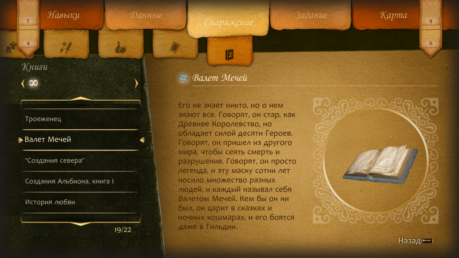"Его не знает никто, но его знают все. Говорят, он стар, как Древнее Королевство, но обладает силой десяти Героев. Говорят, он пришел из другого мира, чтобы сеять смерть и разрушение. Говорят, он просто легенда, и эту маску сотни лет носило множество разных людей, и каждый называл себя Валетом Мечей. Кем бы он ни был, он царит в сказках и ночных кошмарах, и его боятся даже в Гильдии".