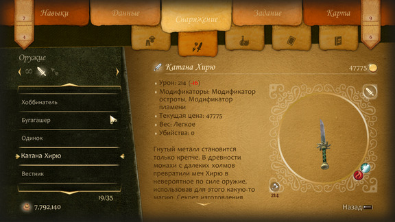 | Модификаторы | "Бритва" (модификатор остроты) "Пламя" (модификатор пламени) |