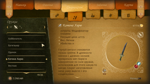 "Прочность металла ограничена. Но монахи далеких холмов своими сверхъестественными силами превратили «Хир'ю» в нечто особое. Тайна ее изготовления умерла вместе с ними".