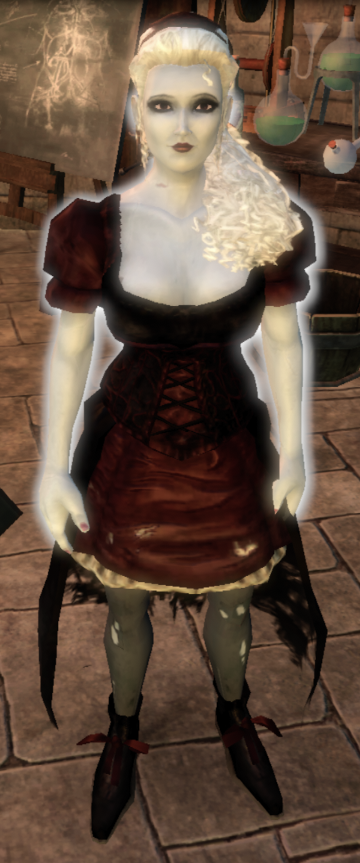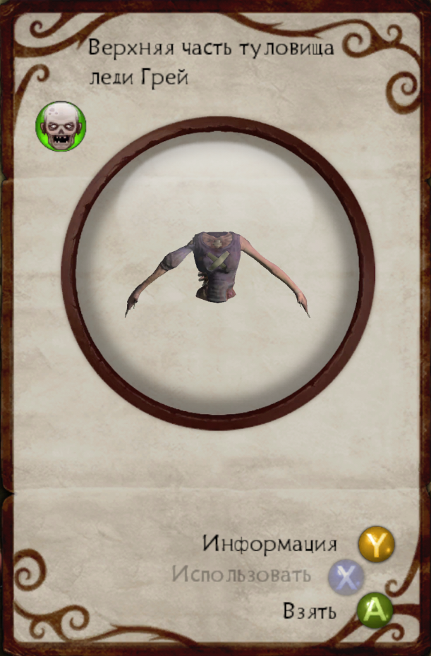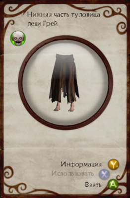 По его словам, леди Грей была мэром Глушвилля в "жуткие, варварские времена", а недоброжелатели "не видели ее истинной красоты". После этого Виктор посылает за верхней частью туловища в могилу Дваклинка (Два-Ножа) в Призрачных топях.