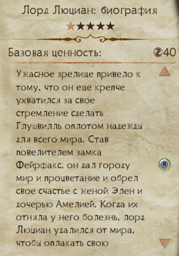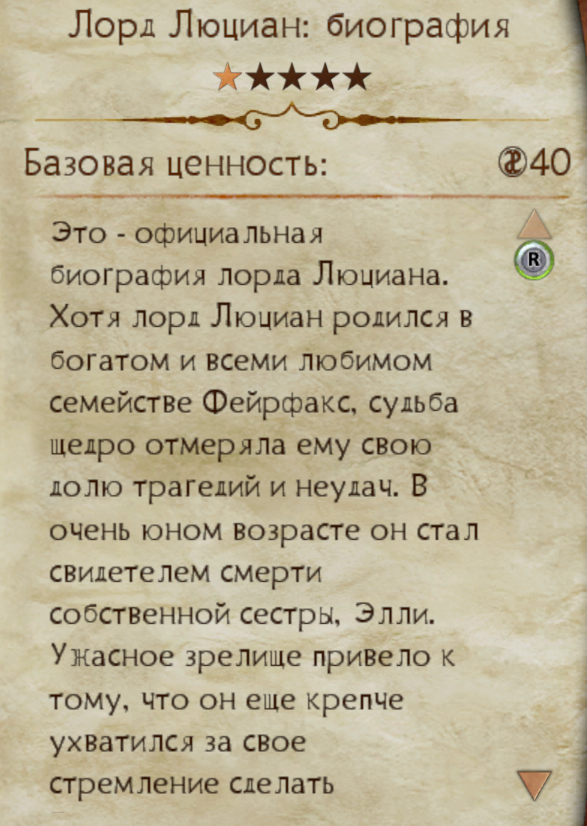 "Это — официальная биография лорда Люциана. Хотя лорд Люциан родился в богатом и всеми любимом семействе Фейрфакс, судьба щедро отмеряла ему свою долю трагедий и неудач. В очень юном возрасте он стал свидетелем смерти собственной сестры, Элли.