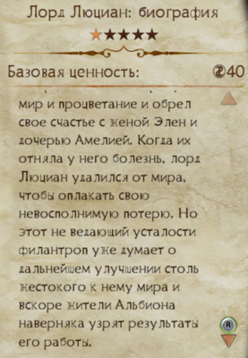 Когда их отняла у него болезнь, лорд Люциан удалился от мира, чтобы оплакать свою невосполнимую потерю. Но этот не ведающий усталости филантроп уже думает о дальнейшем улучшении столь жестокого к нему мира, и вскоре жители Альбиона наверняка узрят результаты его работы".