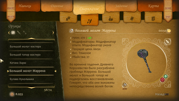 "Во время хаоса, последовавшего за падением Стародавнего королевства, Мурренские могилы были разграблены. Но ни этого молота, ни огромной секиры грабители не нашли. Говорят, что их выковали по приказу самих богов".