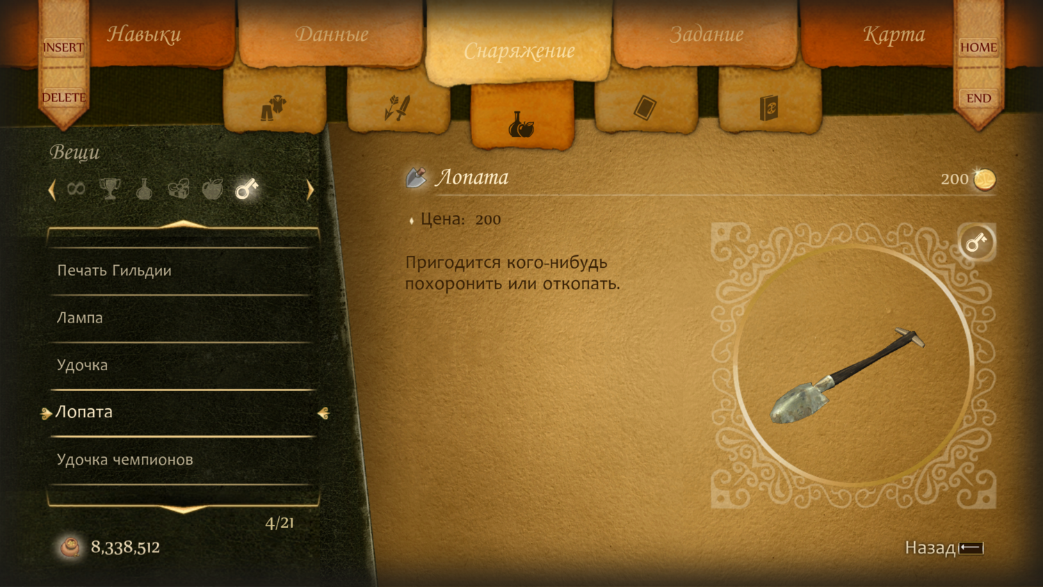 Предмет можно найти в самом начале игры — в сундуке рядом с одной из повозок в цыганском таборе. Лопата стоит 25 золотых, ее можно продать в лавке универсальных товаров, рейтинг — одна звезда.