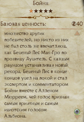 С каждым раундом устанавливая новый рекорд, Бешеный Пёс в конце концов ушёл на покой и стал экспертом и комментатором Бойни вместе с Алленом Мюрреем, чей голос признан самым приятным и самым идиотским голосом Альбиона".