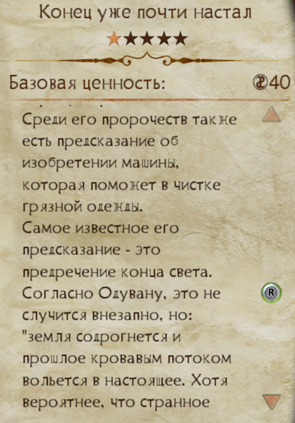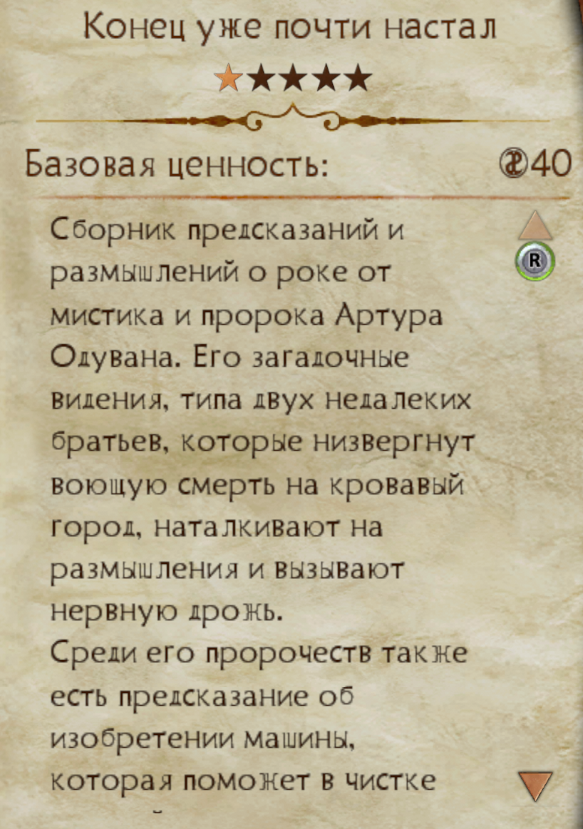 "Сборник предсказаний и размышлений о роке от мистика и пророка Артура Одувана. Его загадочные видения, типа двух недалеких братьев, которые низвергнут воющую смерть на кровавый город, наталкивают на размышления и вызывают нервную дрожь.