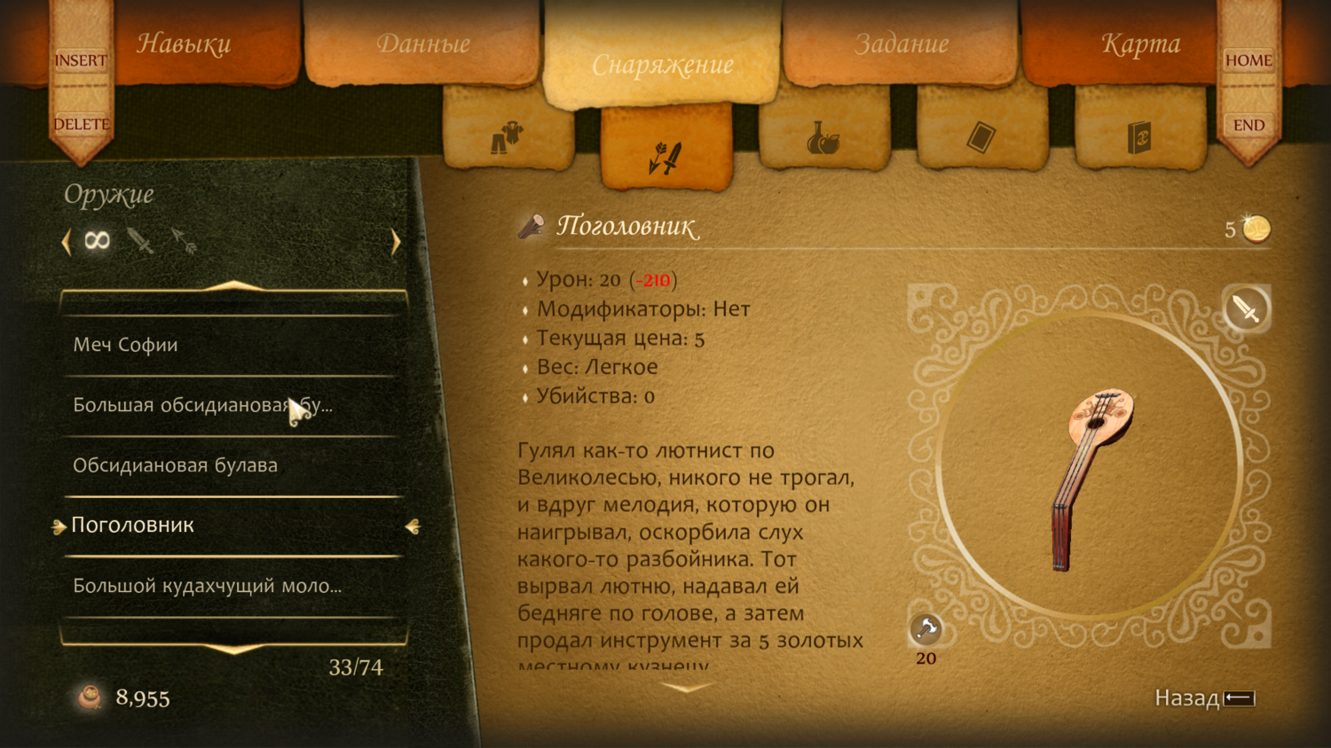 "Гулял как-то лютнист по Великолесью, никого не трогал, и вдруг мелодия, которую он наигрывал, оскорбила слух какого-то разбойника. Тот вырвал лютню, надавал ей бедняге по голове, а затем продал инструмент за 5 золотых местному кузнецу".