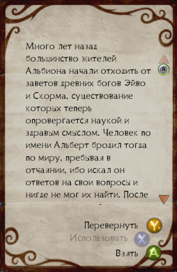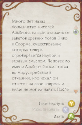 "Много лет назад большинство жителей Альбиона начали отходить от заветов древних богов Эйво и Скорма, существование которых теперь опровергается наукой и здравым смыслом. Человек по имени Альберт бродил тогда по миру, пребывая в отчаянии, ибо искал он ответов на свои вопросы и нигде не мог их найти.